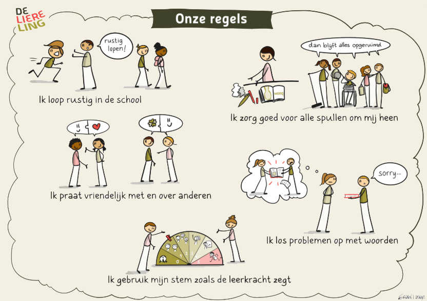 Aan de start van een schooljaar stelt de leerkracht samen met de kinderen afspraken op. Met deze afspraken beloven we elkaar dat we ons best doen voor een fijne sfeer in de groep. De kinderen zetten onder deze afspraken hun handtekening. Naast deze afspraken zijn er ook schoolregels. Deze regels zijn zichtbaar door de hele school en in de klaslokalen. Elke twee weken staat er een regel centraal in de school.